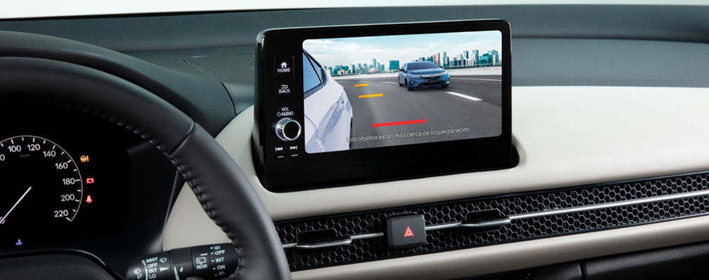 Imágenes ilustrativas. La ZR-V TOURING cuenta con un sistema de reducción del punto ciego. Muestra en pantalla el carril del lado derecho del vehículo gracias a una cámara ubicada en el espejo retrovisor externo, dando una visión 4 veces mas amplia.